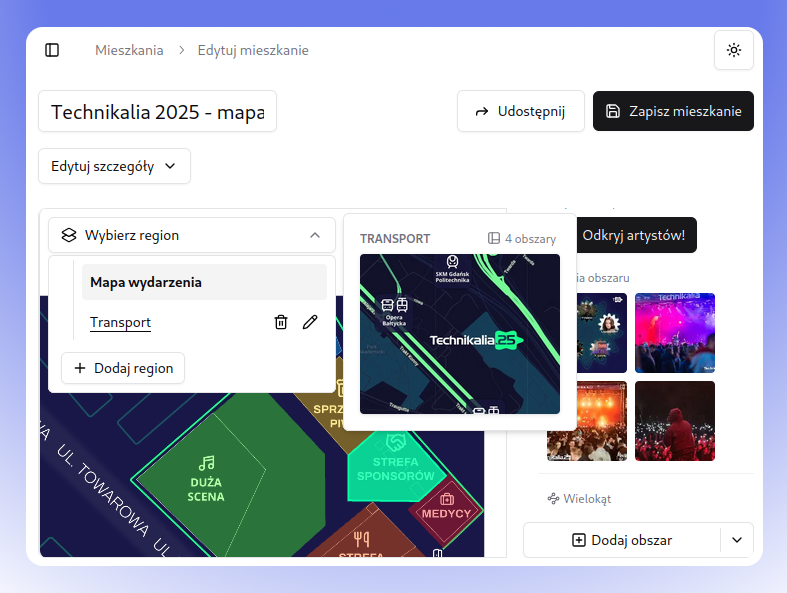 Innowacyjna platforma do zarządzania przestrzenią, która zamienia statyczne plany w dynamiczne, interaktywne mapy. Dodawaj regiony, oznaczaj obszary tematyczne, i twórz zrozumiały, atrakcyjny i interaktywny przewodnik